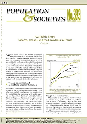 While deaths caused by bovine spongiform encephalopathy can be counted on one hand in France, about a hundred thousand deaths are caused each year by tobacco (around 60,000 deaths in 1995), alcohol (45,000) and road accidents (8,000). A look at the most frequent causes of avoidable death in France shows that the consumption of alcohol is on the decline as are diseases related to alcohol, and that deaths due to road accidents are also decreasing, despite a regular increase in the kilometres travelled. The evolution in the damage caused by tobacco is more complex due to the delay between the consumption and the evolution of the pathologies: it is increasing significantly for women, while it seems to be stabilizing for men.
