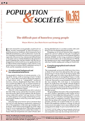 It is not unusual for young people, in particular as they become emancipated, to find themselves in globally precarious situations, albeit temporarily. Such difficult circumstances, such as joblessness or poverty, are sometimes repeated from generation to generation, especially if the person has experienced difficult times in the past, such as a family breakdown, the premature death of parents, has run into trouble with the law, or dropped out of school with few or no qualifications [1]. In order to better understand how some of these young people became homeless, INED conducted a survey in Paris and the immediate suburbs.