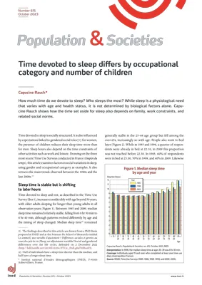 Time devoted to sleep is socially structured. It is also influenced by expectations linked to gendered social roles [1]: for women, the presence of children reduces their sleep time more than for men. Sleep hours also depend on the time constraints of other activities such as work and leisure. Drawing on the three most recent Time Use Surveys conducted in France (Emploi du temps), this article examines factors in social variations in sleep, using gender and occupational category as examples. It also retraces the main trends observed between the 1980s and the late 2000s.1