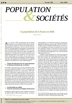 Au 1er janvier 2003, la population de la France métropolitaine est estimée à 59,6 millions d'habitants auxquels s'ajoutent 1,8 million d'habitants des départements d'outre-mer, soit un total de 61,4 millions [1]. En métropole, la population a augmenté de près de 290 000 habitants en 2002 (+ 0,5 %). La croissance a été du même ordre qu'en 2001, l'excédent des naissances sur les décès (l'accroissement naturel) ayant légèrement diminué (les naissances ont été un peu moins nombreuses et les décès, un peu plus) et, à l'inverse, l'excédent des immigrations sur les émigrations (le solde migratoire) ayant légèrement augmenté d'après les estimations de l'Insee (tableau).